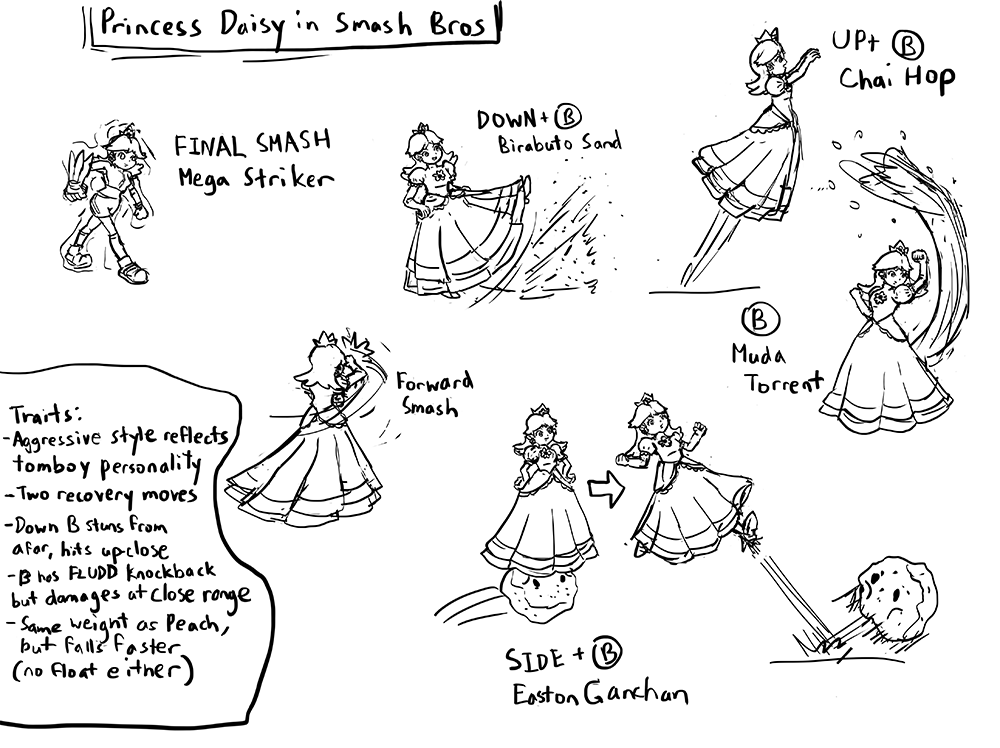 While “clone” characters tend to look different but share similar moves with their base counterparts, Daisy is sort of the opposite, bearing obvious resemblance to Princess Peach but having significantly different attacks from top to bottom. Daisy is often described as being more of a tomboy than Peach, and so I thought it would be cool to have this come out in her attacks. Hence, she does things like throw hooks for Forward Smashes and kicks sand in opponents’ faces. Though not pictured, I see her small animations and jumps being more athletic as well. Of course, her taunt would be “Hi I’m Daisy!”