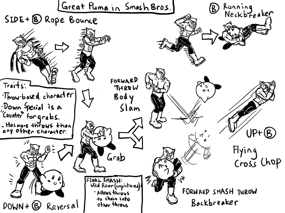 Unlike the previous characters I drew movesets for (King K. Rool, Princess Daisy), Great Puma is much more obscure. He’s the final boss from Pro Wrestling for the NES, and notoriously difficult, if only because all the button mashing you had to do to defeat him would hurt your thumbs (unless you used a turbo controller).