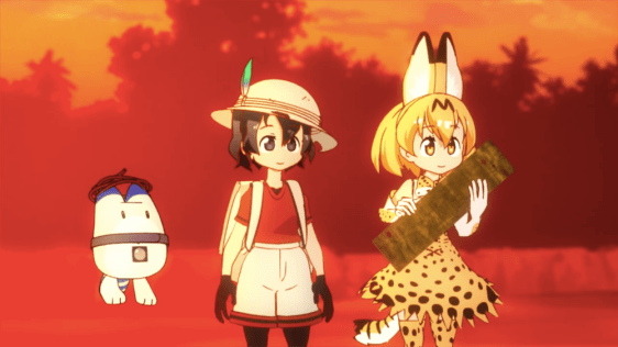 The initial hook of the series is how Kaban (and in fact everyone they meet) is unable to identify what Kaban herself is. Given the dilapidated state of Japari Park, it hints early on that the world of Kemono Friends is more than it seems. Is it a post-apocalypse? Is it something less sinister? The fact that the show maintains its laid-back feeling despite all of that gives the show an unusual charm that’s difficult to find elsewhere. Moreover, in every episode Kaban-chan inadvertently does something that comes easily to humans but is difficult or incomprehensible to the Friends, e.g. handling tools, analyzing situations, etc., which makes for a kind of intriguingly self-reflective position.
