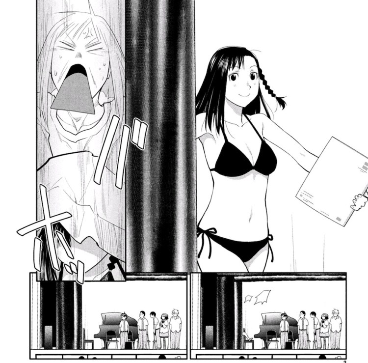 Shion is a certain kind of dumb that leans more towards naivete. In this chapter, she tries to come out in a bikini (similar to how Hasegawa is in her school swimsuit), only to get snatched away by a teacher and forced to change. It’s like she does and doesn’t realize what that would do to a school of mostly boys. There’s just a lot about her character that cracks me up every month, and Kio’s never really written a girl like her. She lacks a certain level of common sense, which I find highly relatable.
