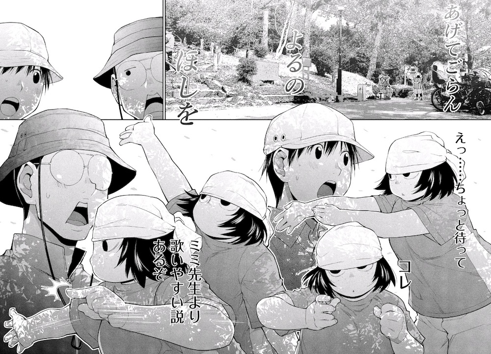 As Hasegawa conducts, Akira and Shinji sing “Miagete Goran Yoru no Hoshi o” by Kyu Sakamoto—the same featured song as the last handful of chapters.