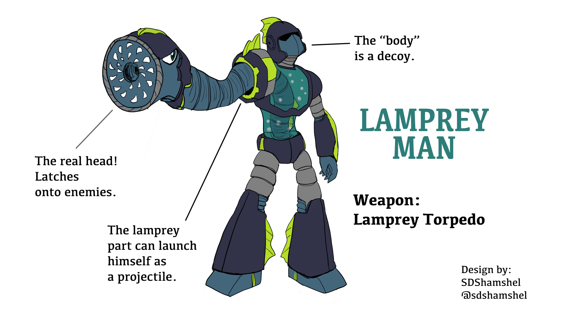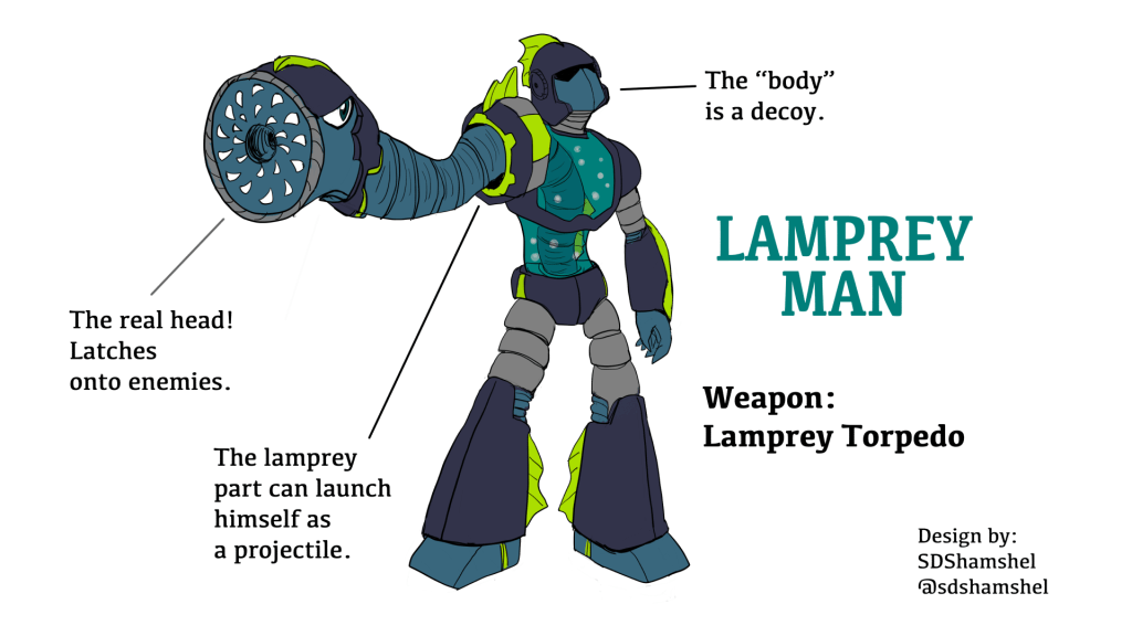 Unfortunately, I didn’t make it into the Top 20. Fortunately, however, that means I can share my design here: Lamprey Man!