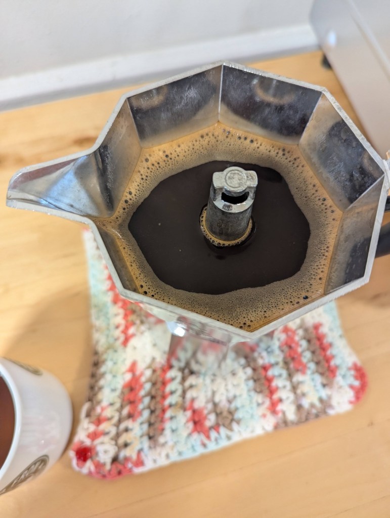 I utilized James Hoffmann’s French press method and a simplified version of his moka pot method. The first differs a bit from the more standard approach by using a finer grind and a couple extra steps, and the second is unlike typical moka pot recommendations in that it uses almost-boiling water and a lower flame. I went with a ratio of 30g of beans to 500g of water for the French Press, and then 30g of beans to 270g of water for the moka pot.