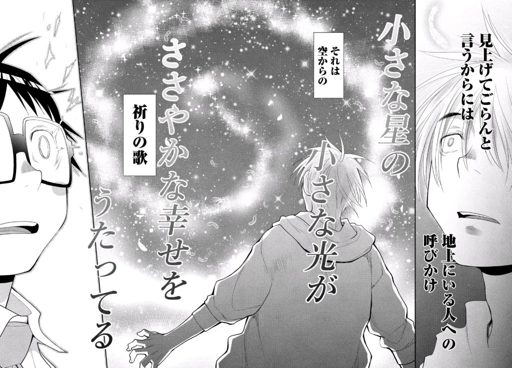 As Jin explains, the song in question was written after the Great Kanto Earthquake of 1923 when the lack of light pollution made the starry sky visible. The stars are a metaphor for people’s souls, and the song itself functions as a song for repose of the soul. Akira’s interpretation as a song of prayer approaches it from a different angle. To him, the lyrics seem like they’re calling out to the souls of those who have been lost, but the second half makes the name of the song sound like a comforting call to those left on Earth.