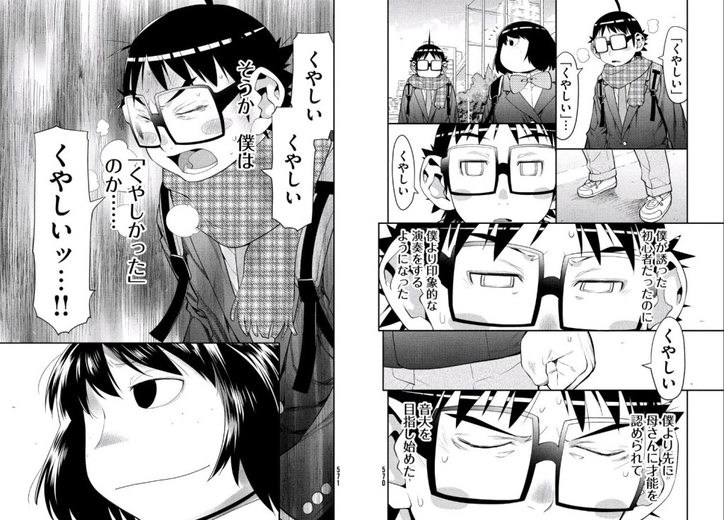 Kozue catches up to Jin, who has left the clubroom because he’s lost the music inside of him. As the two walk and talk, Kozue helps Jin put words to what’s been bothering him: He’s frustrated over what he hasn’t been able to do, and it’s eating him up inside. In particular, Jin is frustrated over Akira being putting on such powerful performances despite being so inexperienced, and over Akira being recognized by Jin’s mom before Jin himself.