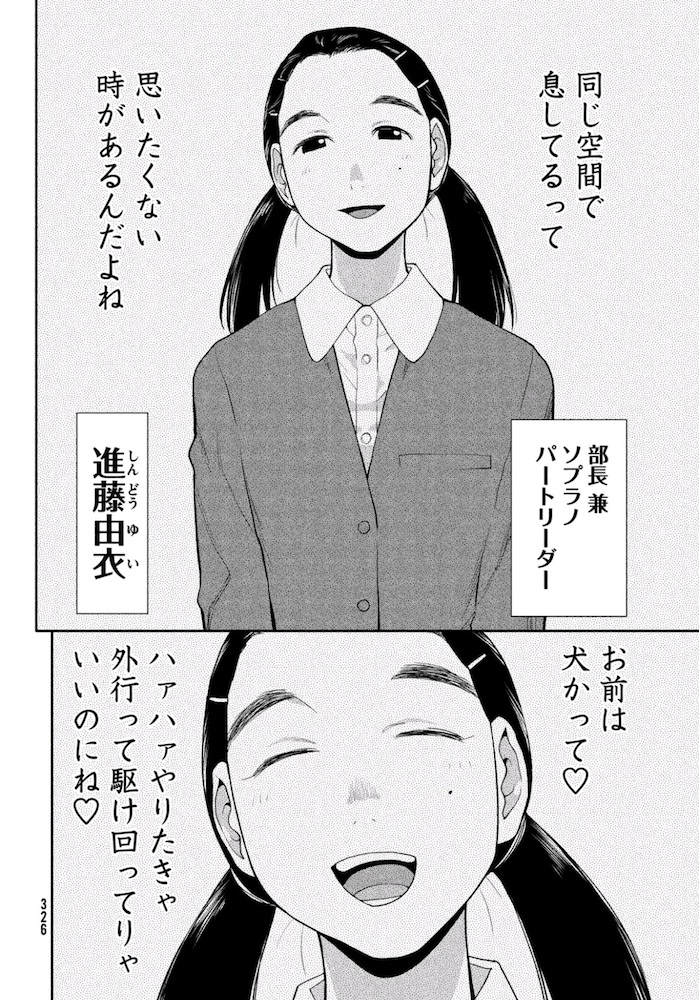 Part of the imagery of Yumerun grinding her teeth is that it “rhymes” with the panel of Shion doing the same out of frustration over not being able to play the accompanying piano. But beyond that, I really can’t seem to figure out why Yumerun is expressing some dismay over seeing Jin sing there. Their mutual past might be even more complicated than I first thought, and I wonder if maybe Yumerun is actually there on behalf of Jin’s mother. If not, maybe Yumerun sees chorus singing as somehow painfully common. I’m sure there’ll be more information in the coming months, but for now, this has me fascinated.