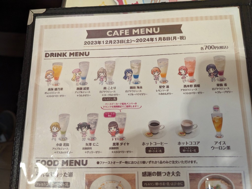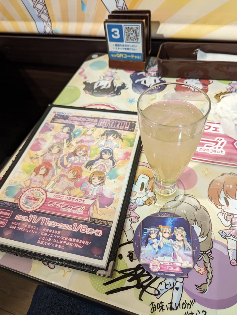 The only other collabo cafe/restaurant I’d attended had been for Legend of the Galactic Heroes, which is aesthetically and thematically quite far-removed from Love Live! However, one thing it had in common with the Love Live! cafe is that you could also get merch by ordering food and drinks. In this case, the items consisted of coasters selected at random (of course), with drinks and desserts netting patrons one coaster and main courses two.