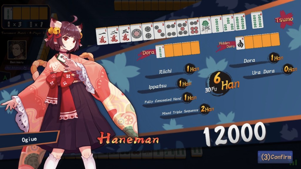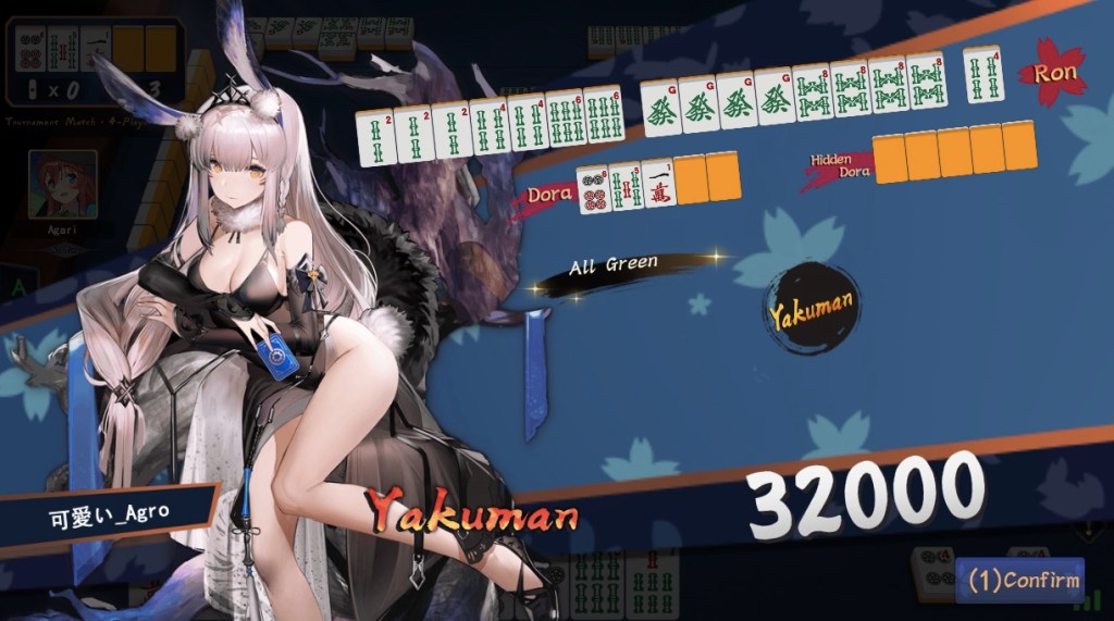 If I had one complaint about the tournament, it’s that it was too long. There were no time limits on each full game, and while typical games of Japanese mahjong online end if first place manages to get above a certain point threshold, that was not the case here. Rather, if it’s South 4, and the dealer is in first place, they can actually just keep winning and winning, bringing up their final score. I suspect that this is done out of a sense of fairness (“Why should the other three players be allowed to get dealers’ runs going unimpeded, but the other one can’t?”), but it did drag the games on. Also, the twenty-minute halftime break was maybe not enough time to take a breather and relax, as real-life tournaments I’d attended had allowed for a proper full hour. I understand, however, that it would have been a Catch-22—do you extended the break and thus make the tournament end even later?