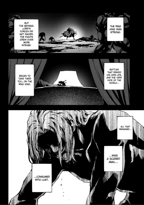 Suddenly, a manga about an ideal male power fantasy, the harem of hot and powerful babes, carries a lesson that there’s a difference between genuine love and the desire for control and power that leads to abusive relationships. It’s not enough to have all the women, but to treat them with respect as well. Otherwise, the fate that the first Ring King brought upon himself through his violent behavior might very well befall Satou as well.