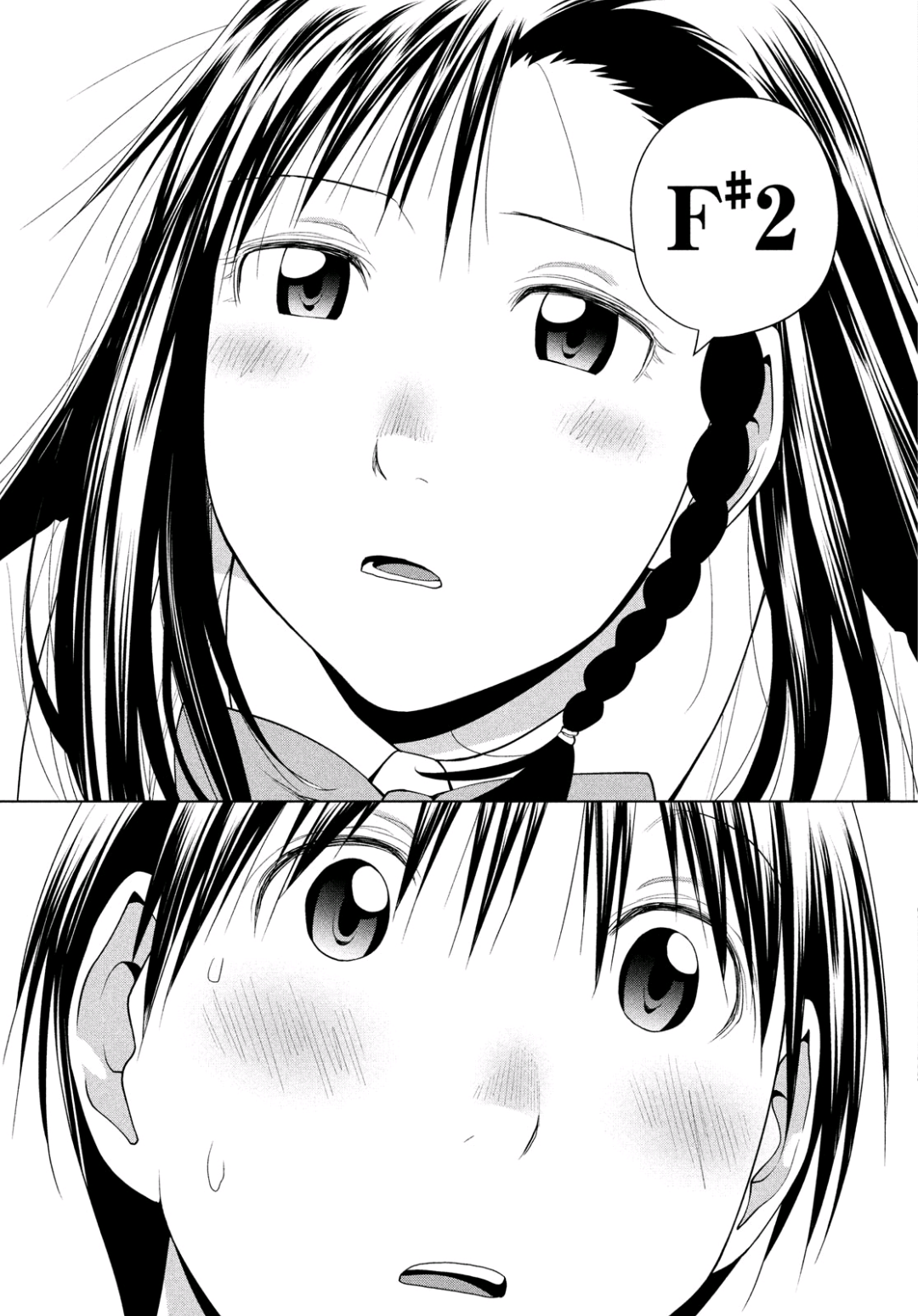 As Yukina is celebrating the win and talking with Kousei, Shion can’t help but think that they look great together. Suddenly, she sticks her arm between them and confesses directly to Kousei: “I like you. Go out with me?” Kousei’s response: “What? No.” That rejection is also the title of the chapter.