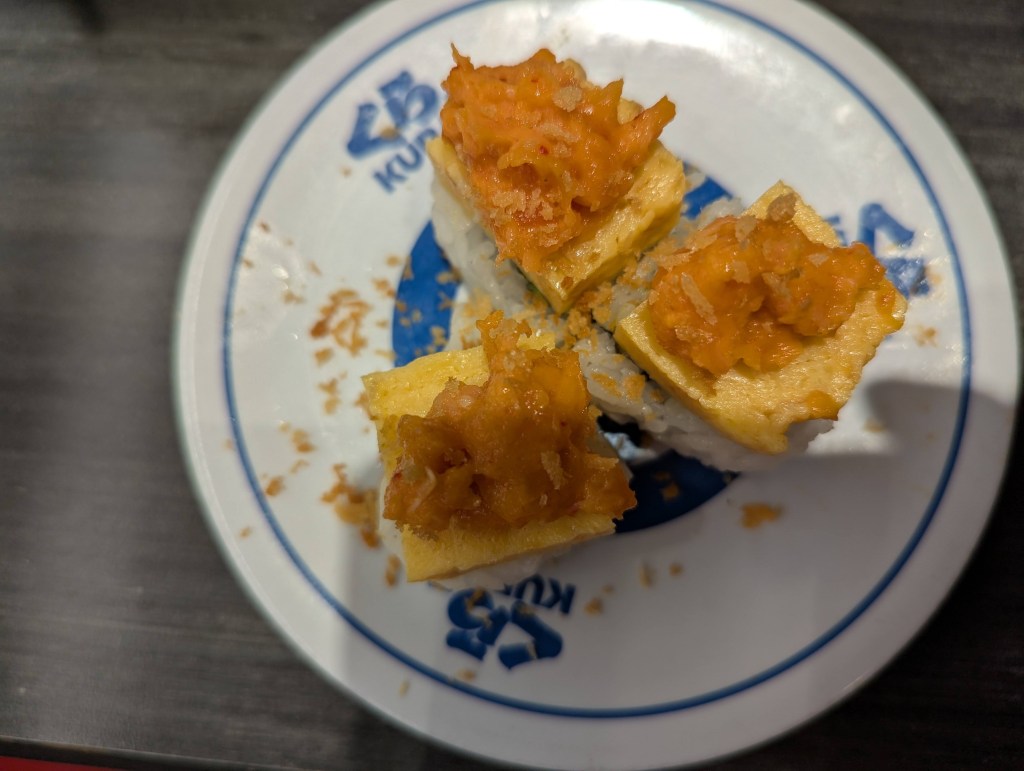 Gigi’s “Salmon & Tamago Spicy Roll, made with spicy salmon and tamago atop a shrimp mayo roll finished with panko crunchy flakes.”