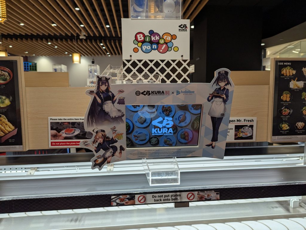 The revolving sushi restaurant chain Kura Sushi has been doing a collaboration with hololive, and I decided to check it out. By the time I got there, the available merch was done, but that was okay. My real goal was to taste the hololive-themed sushi.