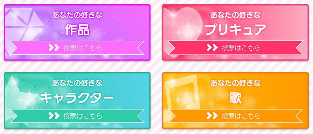 This poll includes all TV series and all movies, and the four categories are as follows: favorite work (pick 1), favorite Precure (pick 3), favorite other characters (pick 3), favorite songs (pick 3).