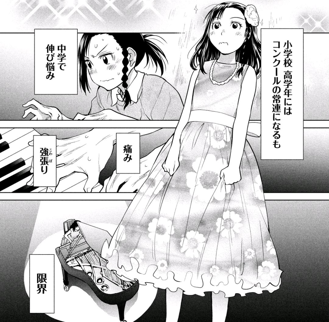 The wrist sprain is very akin to Madarame’s from Genshiken’s (he fell while at a doujin event), and it makes me wonder if Shion is actually supposed to be the Madarame of this series, only less self-aware. She has a sort of ponkotsu quality, but it’s not like she’s untalented or constantly failing. You could call her moe, but she’s less endearing and more exasperating. There’s a point in the chapter when Shion is describing how she doesn’t understand how anyone could do keep track of all the different subtleties in how hard to tap, nor how anyone could do two completely different things with their left and right hands, only for the rest of the characters to yell at her about how that’s a perfect description of playing piano.