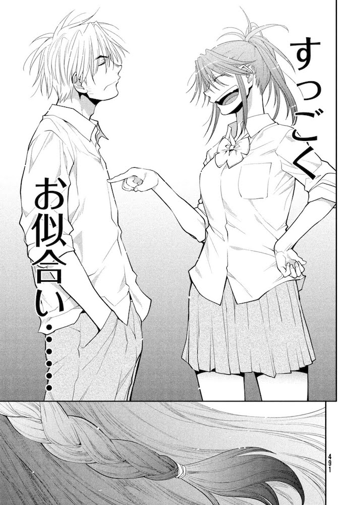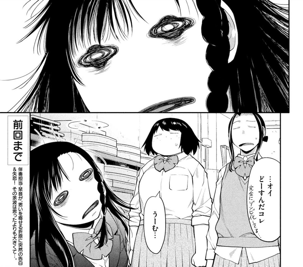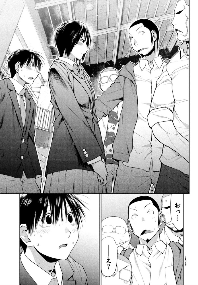 As Yukina is celebrating the win and talking with Kousei, Shion can’t help but think that they look great together. Suddenly, she sticks her arm between them and confesses directly to Kousei: “I like you. Go out with me?” Kousei’s response: “What? No.” That rejection is also the title of the chapter.