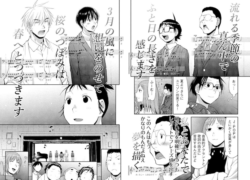 As the guys are singing, Takano-sensei makes mention of how much they’ve all improved (as well as Kozue’s excellent conducting). In particular, she remarks about their successful balancing of both the lyrics-heavy nature of J-pop with getting the right musical accents. She also uses a couple terms that I think are worth noting—mostly for my sake, as someone who’s not musically inclined.