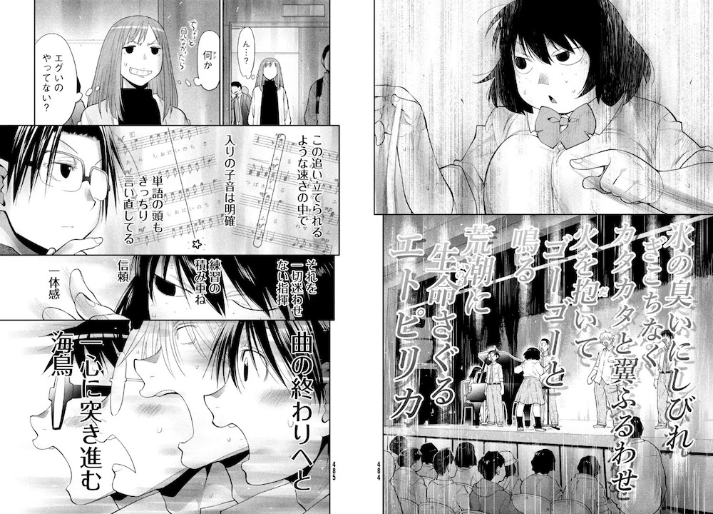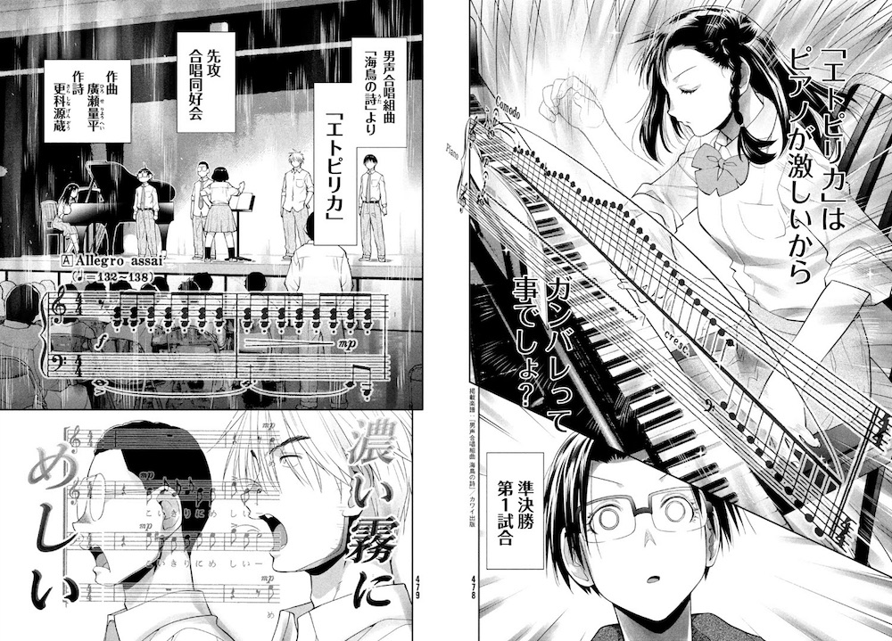 Just like in the last chapter, we have an amazingly drawn scene of a Chorus Appreciation Society performance. What stands out to me about their “Etupirka” is that even if you don’t know what the song actually sounds like, Kio’s artwork conveys its sheer intensity. It’s not just the trembling line effects throughout the performance, but the way the characters are drawn with such dynamism even while they’re standing still, as well as the choice to use that initial extreme angle to depict Shion’s piano-playing (as seen in the top image) makes it seem like the ground is trembling. It borders on a more exaggerated representation that one might find in an action-packed shounen manga that uses music as its gimmick the way Yakitate!! Japan and Food Wars: Shokugeki no Soma approach food.