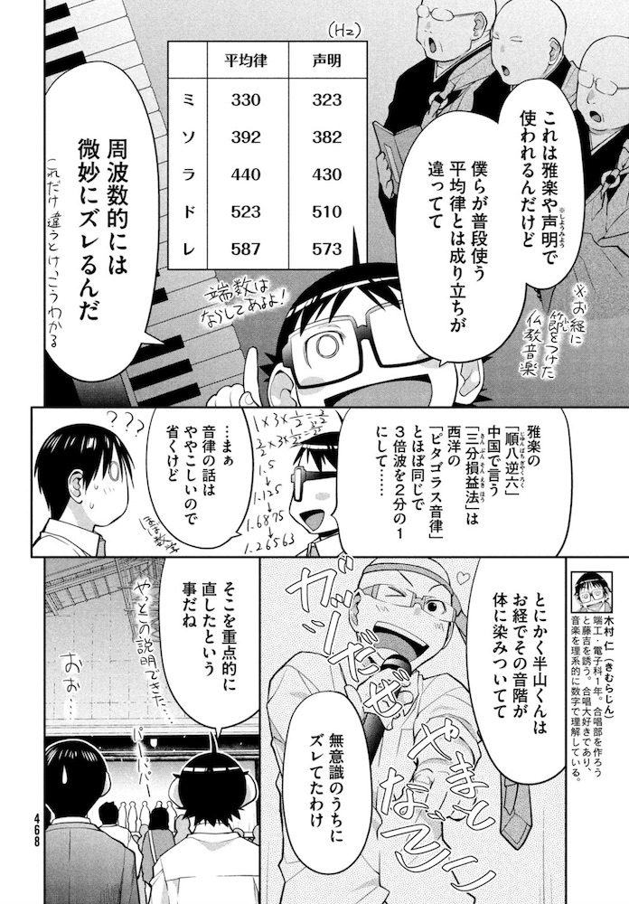 At one point, the subject of Hanyama’s inability to sing on-key comes up, and Jin reveals that what everyone assumed to be a case of being tone deaf is actually something else entirely. He recounts having tested Hanyama, and it turns out that the guy unconsciously sings on a scale different from the traditional Western music scales due to his family running a Buddhist temple. Instead, Hanyama sings according to what the Japanese calll junpachi gyakuroku(“upward eight, lower six”) or sanpun son’eki ho, which is also known as the Chinese 12-tone musical scale—which coincidentally is also the same as Pythagorean tuning. It results in the kind of music you get from Buddhist chants (shoumyou) and Japanese imperial court music (gagaku).
