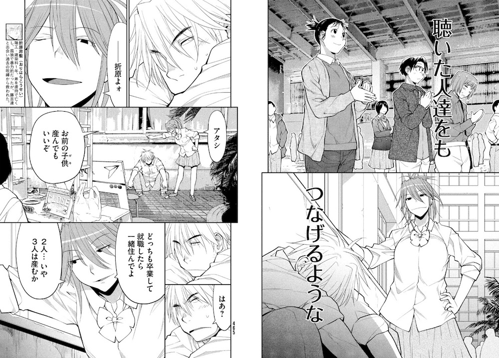 Hashikko Ensemble is notably different from pretty much all of Kio’s previous works in the way that there’s a concrete underlying goal for its cast. Whether it’s Genshiken or any of the series that have preceded or followed it, Kio’s stories have always been more about exploring character relationships in spaces devoid of strong ambition. Hashikko Ensemble is very much about the characters and how they connect with one another, but the theme of music and an in-story goal of forming a proper club (and a proper chorus) means that there’s a good deal of forward momentum that’s absent in Kio’s other manga—with the arguable exception of Kujibiki Unbalance. Seeing that relatively more “focused” Kio Shimoku manga makes me wonder how things would go if he took it a step further, maybe even into a more adventure-type work, or something like palace intrigue.