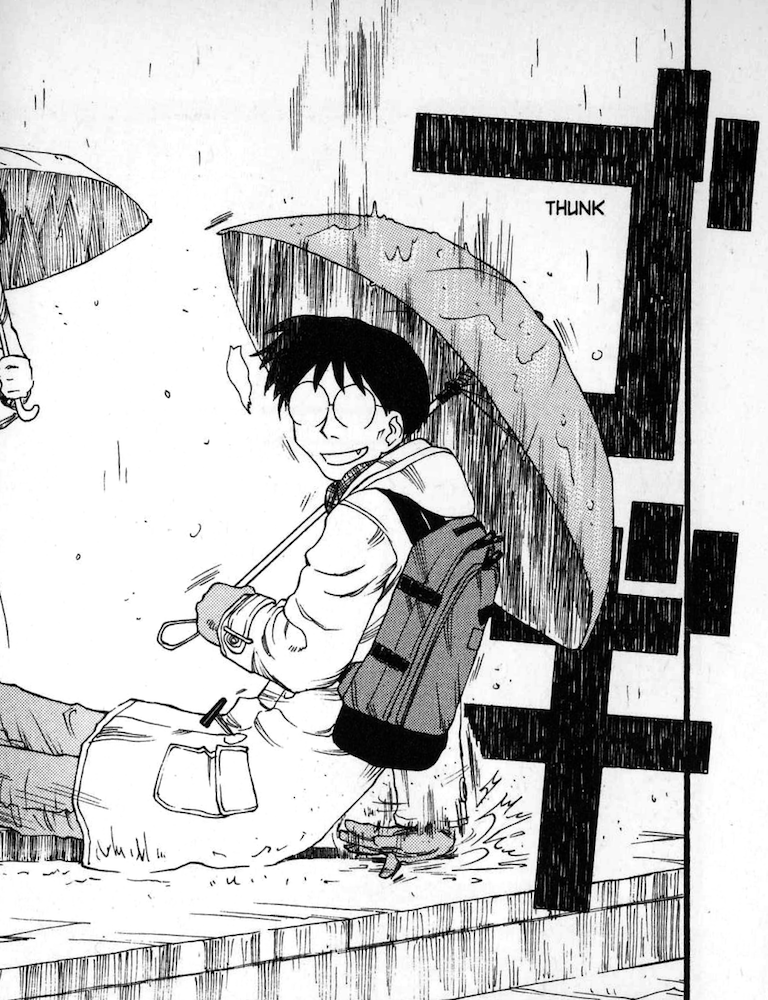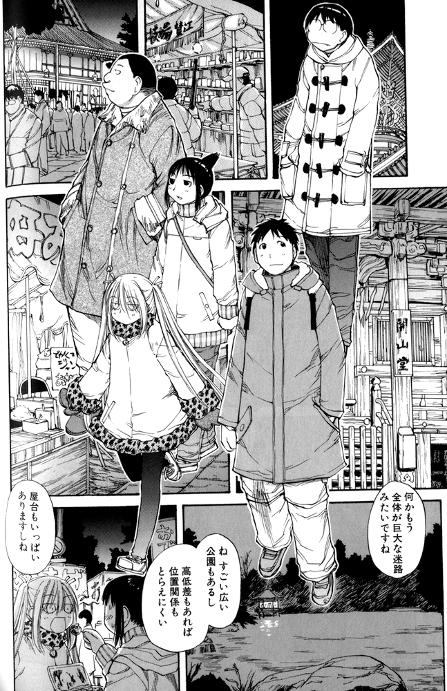 That chapter is also an exercise in creativity for Kio, which is something I see in Volume 9 more generally. Earlier in the volume, when the characters are visiting a shrine in Narita for New Year’s, there’s an image of the group walking around, overlaying a bunch of other panels showing off the scenery. I have to wonder if these are the seeds that lead to the more dynamic (perhaps one could say shoujo-esque) paneling of Nidaime, and if that shrine visit is the start of Kio’s fondness for dumping tourist information into his series.
