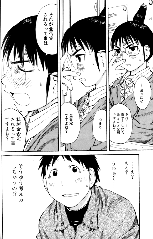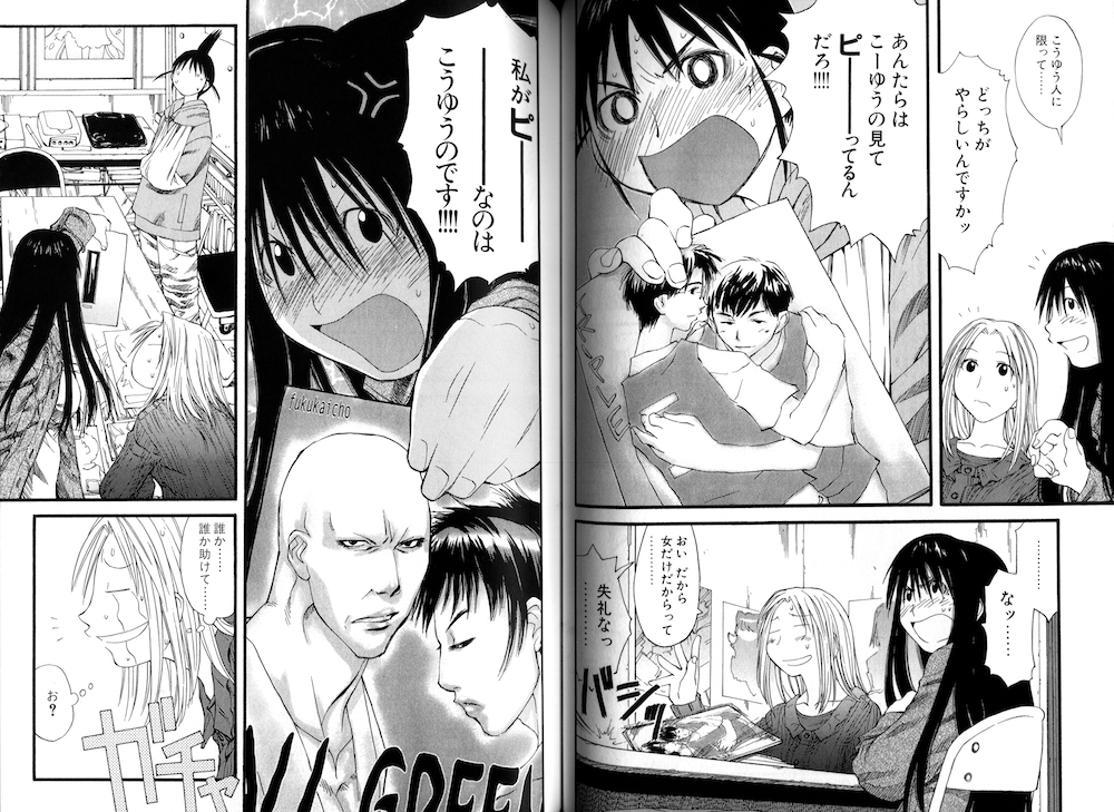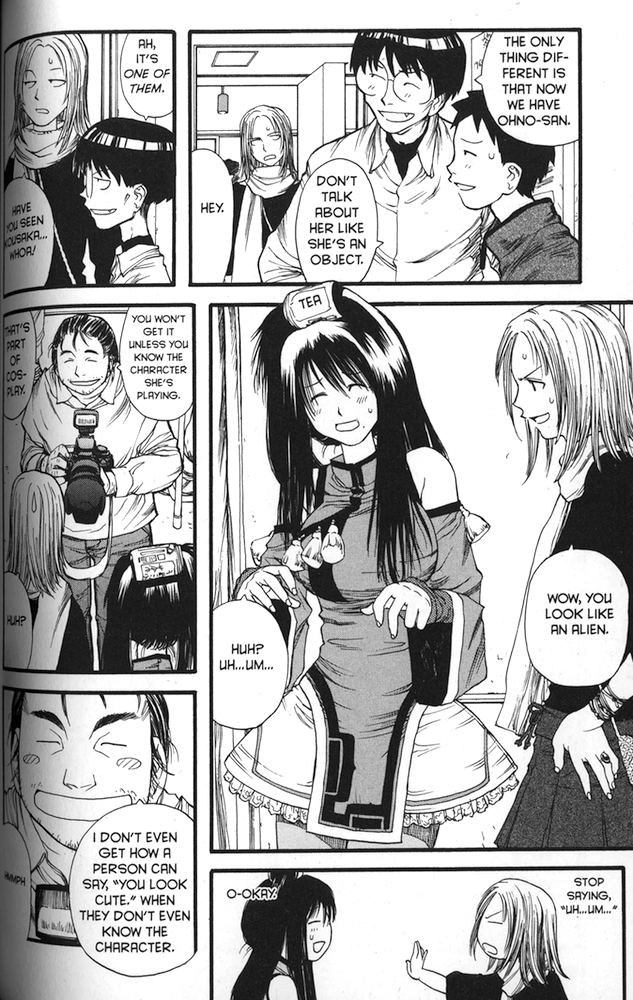 This quality of hers is seen in Volume 9, when Ogiue asks Sasahara (who’s now working as a manga editor) to look over her submission for a published manga magazine (Monthly Afternoon, the home of Genshiken, as we later learn). Here, we find out Ogiue tends to take criticism very personally. In her eyes, comments about the lack of a clear protagonist and a too-long introduction are attacks on her character and her ability, and she lashes out at Sasahara. But as Yabusaki points out, Ogiue’s not the type to give up easily. Motivated by rage, she revises her manga (and draws a second submission!) in a way that incorporates Sasahara’s advice. So it turns out that she’s bad at receiving criticism but great at utilizing it—a volatile combination that Sasahara somewhat laments.
