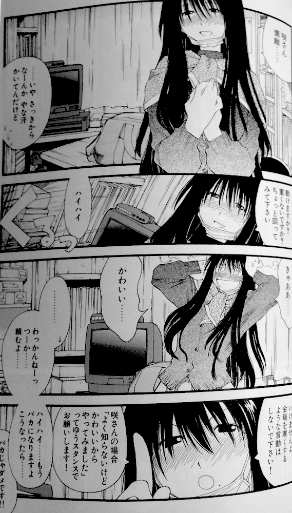 The final side story for Genshiken series 1 involves everyone having post-graduation drinks, when Madarame brings up a topic of discussion: “What would make Kasukabe be moe?” They go through different possibilities (sexy character, tsundere), only to realize that other girls closer fit those archetypes (Ohno and Ogiue, respectively). Madarame thinks the only way it’d work is if Kasukabe were a virgin, such that her insecurities became her vulnerability and thus her moe quality. Kasukabe asks Kohsaka what’s moe about her, and his answer is nothing. The other girls then wonder if Kasukabe really hasn’t noticed Madarame’s feelings, and the entire manga ends with her looking at them (and the viewer), oblivious.
