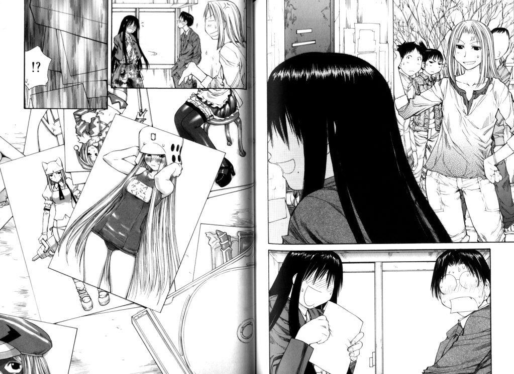 But Madarame’s confession isn’t the only time silence plays a major role. One of the highlights of Volume 9 is a special chapter dedicated to showing Kasukabe finally doing a joint-cosplay photo shoot with Ohno. The story has Kasukabe an unwilling victim of her own promise, Ohno trying to sneakily give photos of Kasukabe to Madarame, Ohno getting clocked for her efforts, and everyone getting ready for the graduation. This is done entirely without dialogue or sound effects (the sole word balloon being a “!?”), and it creates a powerful mood as the penultimate chapter. The fact that it comes directly after “Confession”—silence following silence, so to speak—might be coincidental, but it only adds to the feeling that “this is it, the end of Genshiken.”