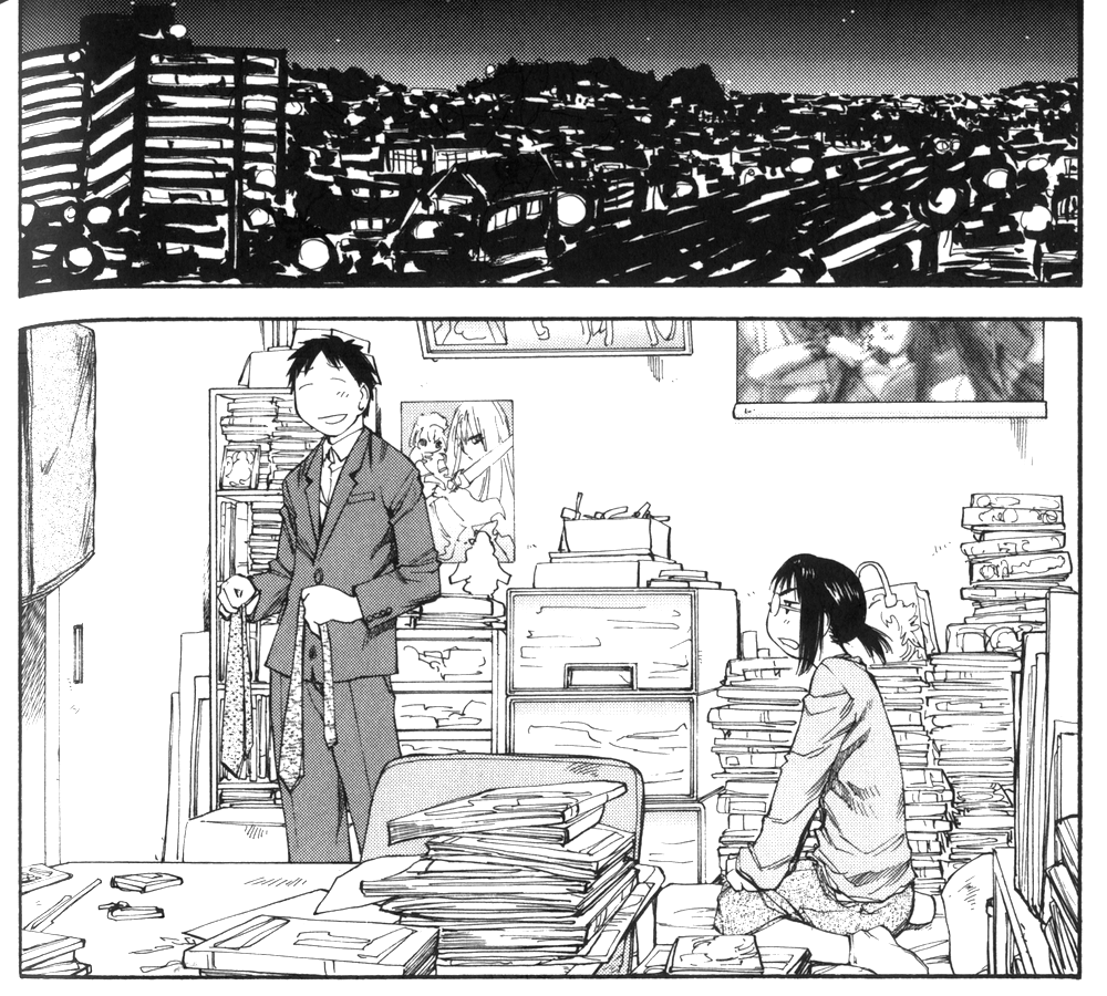 Before moving to the next topic, there’s an interesting panel in the silent chapter: an unfinished drawing of nighttime that leads into a Sasahara and Ogiue scene. It’s clearly not meant to be unfinished in that “roughness makes it look more interesting!” way, and it’s never been fixed or corrected. This isn’t a big deal, but it stands out all the more because of how detailed the scenery and environmental backgrounds typically are in Genshiken.