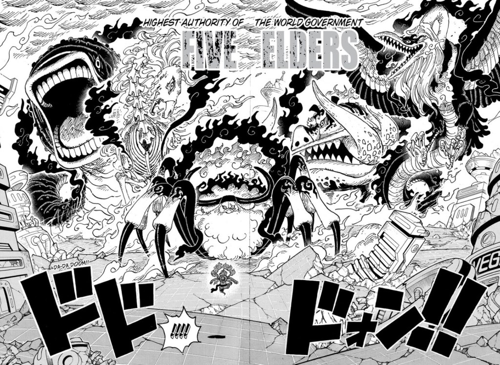 The milestone in question is the long awaited arrival of the Five Elders into the main story and the full debut of their monstrous alternate forms. The impact they have is almost unparalleled—something that only a select few series can ever accomplish because they lack the longevity. The only one that springs to mind aside from One Piece is Detective Conan, whose main bad guy is still shrouded in mystery even after some major revelations.