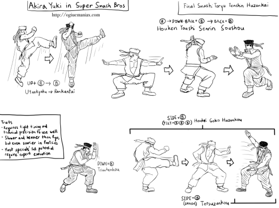 Fighting as Akira should feel like you’ve out-thought your opponents, and your reward is a highly refined punish game consisting of short and sweet combos that nevertheless do scary amounts of damage. Fighting against him should make you feel bad for getting called out over and over for your predictability. At the same time, execution shouldn’t be too difficult, as it goes against the spirit of Smash Bros., but should be tricky enough that you can’t just buffer and mash and succeed. In terms of general stats, Akira would be heavier and slower than Ryu, and would of course lack a projectile move. He would be below mediocre in the air, given that Virtua Fighter characters are typically not known for their leaping prowess, and would be vulnerable to edgeguarding. On the ground, however, Akira would be a menace in a way Little Mac isn’t. He would have fast attacks with poor recovery time, rewarding intelligent exploitation of rock-paper-scissor scenarios but punishing Akira for bad decision-making and guesses.