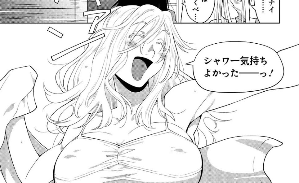 The Genshiken Angela was implied to be very sexually experienced compared with most, if not all of the other characters—not surprising, given most were socially awkward dorks. Spotted Flower is a different beast, as it’s a story where sex and promiscuity are present in spades. Yet, even here, the aura Not-Angela gives off is still a level above the others, even if not much is actually shown. That said, a very exposed Not-Angela both gets a gratuitous shower scene and also tries to have a threesome with Not-Sue and Not-Ogiue the first night she’s there, so it might just be a matter of time.